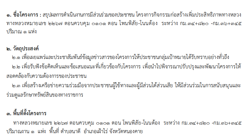 วันที่ 18 ธันวาคม 2568 เวลา 08.30 น. ณ หอประชุมโรงเรียนบ้านนาดีพิทยาคม อำเภอเฝ้าไร่ จังหวัดหนองคาย นายมนูญ ชูตรี ผู้อำนวยการแขวงทางหลวงหนองคาย กำหนดจัดประชุมโครงการการมีส่วนร่วมของประชาชนประจำปีงบประมาณ 2569 โครงการก่อสร้างบริเวณ ทางหลวงหมายเลข 2267ตอน โพนพิสัย - โนนต้อง ระหว่าง กม. 34+ 820 - กม. 36+345 เพื่อให้เป็นไปตามระเบียบสำนักนายกรัฐมนตรี พ.ศ.2548 ว่าด้วยการรับฟังความคิดเห็นของประชาชน